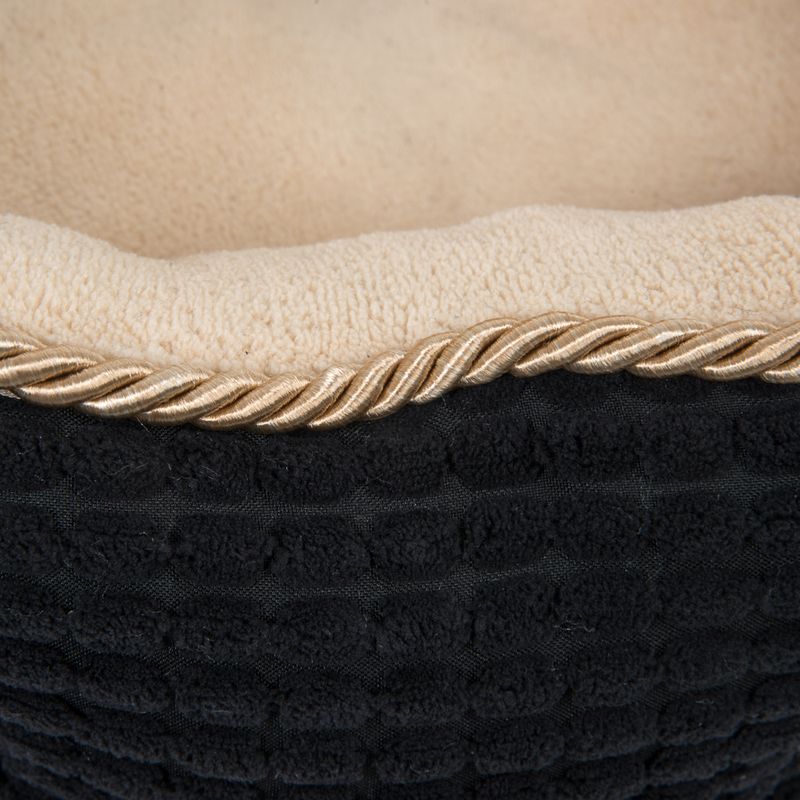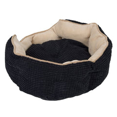 Cleaning is a breeze, thanks to its washable design (up to 30°C). The black exterior, beige interior, and gold trim add a touch of class to your pet's space. Crafted from 100% polyester, the textured exterior and fleece interior ensure a plush experience.