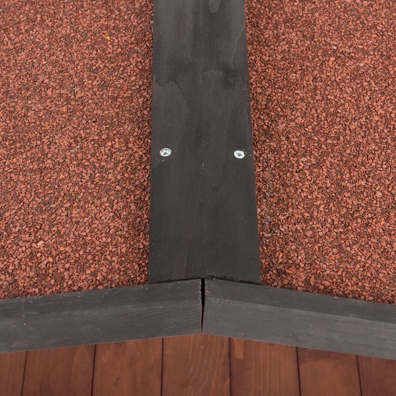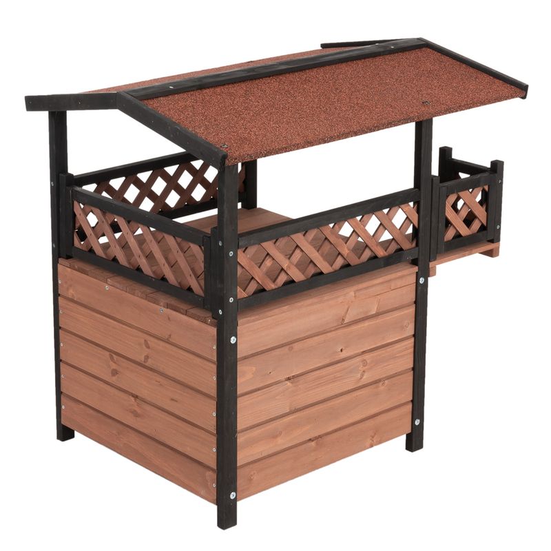 Assembling this wooden cat house is a breeze, thanks to pre-assembled elements. Crafted from pinewood with an asphalt roof, it boasts a charming brown and red color scheme. The dimensions, including an elevated laying surface and covered roof terrace, ensure comfort for your pet.