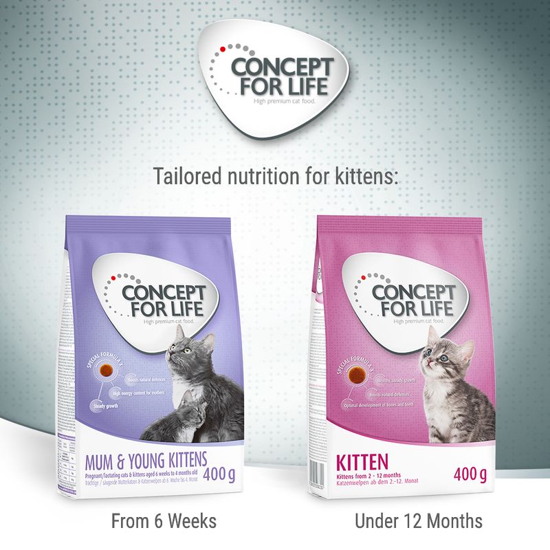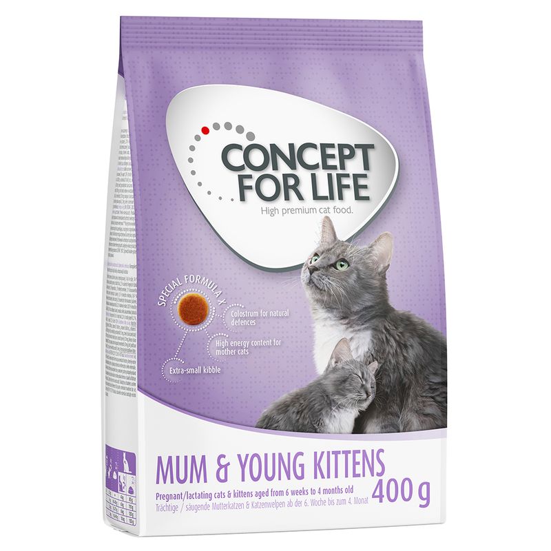 Concept for Life – tailored nutrition for your pet. Concept for Life Mum & Young Kittens dry cat food is available in the following sizes: 400g*, 3kg, 10kg and 2 x10kg * Please note: 400g / 2kg variants are not made with fresh meat