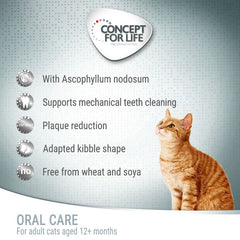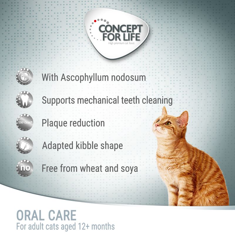 For a long and active cat life, Concept for Life Oral Care is a complete dry cat food specifically formulated to counteract tartar development, bad breath, tooth decay, and inflamed gums. Suitable for cats aged 12 months and over, it actively supports oral and dental health.