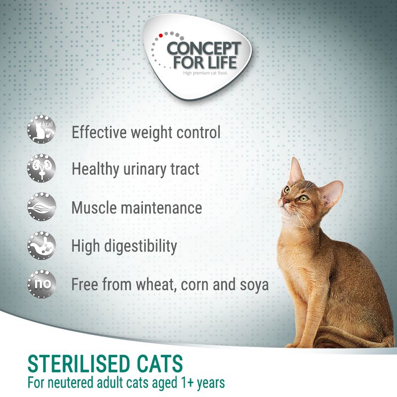 After sterilization, your cat's needs change, and Concept for Life Sterilised Cats addresses these changes with a scientifically based nutritional concept. The FORMULA X actively supports lifelong health, providing species and need-based nutrient composition for optimal all-round care at every life stage.