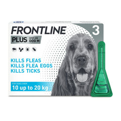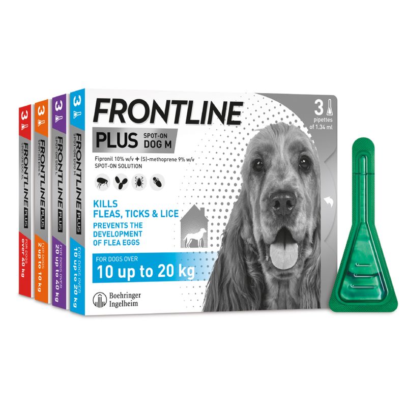 Ensure you use the correct pipette size based on your dog's weight. FRONTLINE® Plus Spot On for Dogs - M (10-20kg) is an AVM-GSL veterinary product. Refer to the package leaflet for proper use, and use medicines responsibly as it contains fipronil and s-methoprene.
