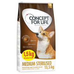 Concept for Life Medium Sterilised dry dog food is a comprehensive solution for weight control and maintenance. With increased protein, L-carnitine, and adjusted fat content, it supports ideal weight, crucial for preventing post-sterilization metabolism changes. The 28% protein content aids muscle maintenance, complemented by a rich vitamin mix.