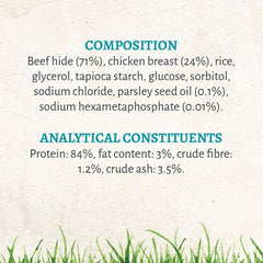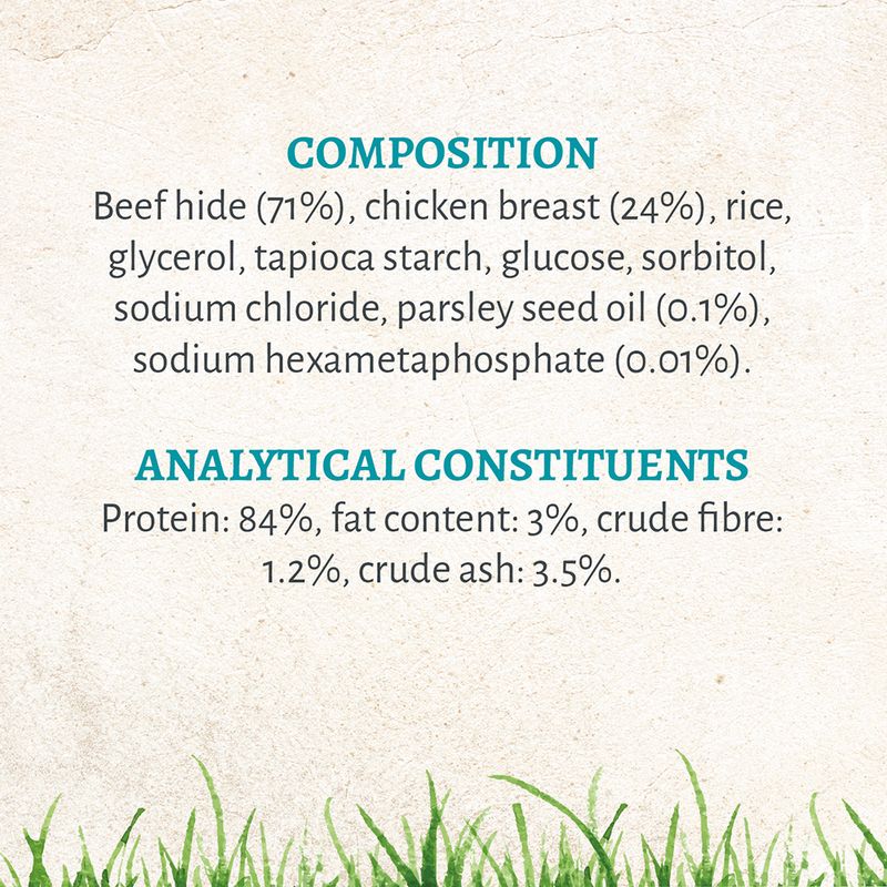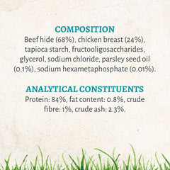 Ingredients: Beef rawhide (68%), chicken breast (24%), tapioca starch, fructooligosaccharides, glycerin, sodium chloride, parsley seed oil (0.1%), sodium hexametaphosphate (0.01%).