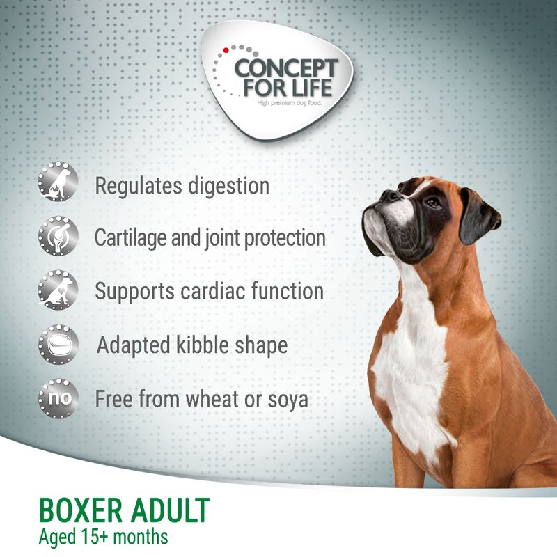 Concept for Life Boxer Adult dry dog food provides a balanced diet and optimal holistic care, formulated to meet specific requirements and promote all-round health and well-being.