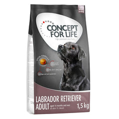 Concept for Life Labrador Retriever is a premium, complete dry food for adult Labradors, available in sizes: 1.5kg, 6kg (4 x 1.5kg), and 12kg.