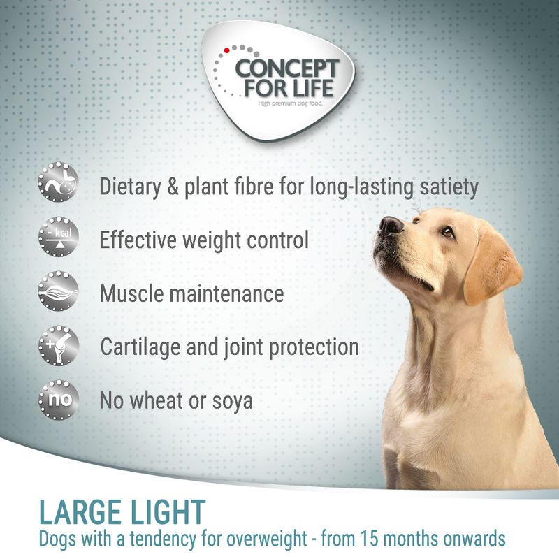 Concept for Life Large Light is a complete dry food for adult dogs. Ingredients: Poultry protein (29%, partially dried and hydrolysed), rice, maize, fresh chicken meat (12%), lignocellulose (5.5%), dried sugar beet pulp (3.5%), poultry fat, linseed (2.0%), sodium chloride, brewer’s yeast (dried), potassium chloride, salmon oil (0.15%), monocalcium phosphate, sunflower oil (0.1%), chicory inulin (0.1%), psyllium husks (0.1% dried), glucosamine from animal tissue (0.04%), chondroitin sulphate (0.02%) Energy per kg: ME (FEDIAF, 2019) 14.3MJ / 3403kcal Additives per kg: Nutritional additives: Vitamin A 15000&nbsp;IU, vitamin D3 1400&nbsp;IU, vitamin E 400&nbsp;IU, vitamin C 300mg, vitamin B1 15mg, vitamin B2 15mg, vitamin B6 / pyridoxine hydrochloride 10mg, vitamin B12 220mcg, niacin 40mg, calcium-D-pantothenate 40mg, folic acid 1.5mg, biotin 400mcg, choline chloride 3000mg, L-carnitine 100mg, copper (copper(II) sulphate pentahydrate) 12.5mg, zinc (zinc sulphate, monohydrate) 100mg, zinc (zinc chelate of glycine hydrate (solid)) 60mg, iron (ferrous sulphate, monohydrate) 250mg, manganese (manganous sulphate, monohydrate) 30mg, iodine (calcium iodate, anhydrous) 2.2mg, selenium (sodium selenite) 0.40mg Technological additives: Antioxidants