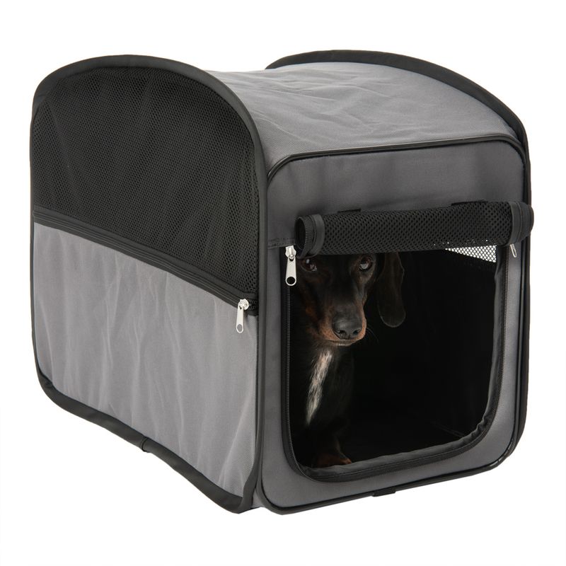 Enhance your pet's experience by placing a cushion or blanket inside the transport box for added comfort. The Fiona Collapsible Dog Transport Box, available in a stylish grey/black color, offers a convenient pop-up and fold-away design with no assembly required. It's an ideal solution for pet owners who prioritize their furry friends' comfort and safety.