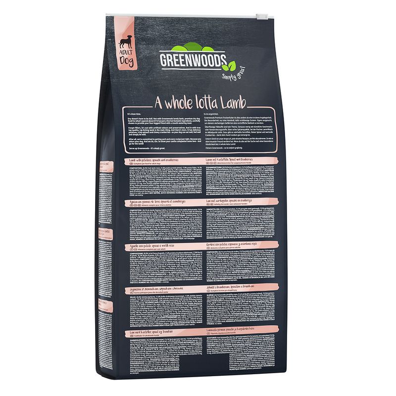 Dinner's Ready! Greenwoods Lamb with Potatoes, Spinach & Cranberries grain-free premium dry dog food is full of scrumptious meat and healthy veg - because dry doesn't mean dull. So what’s special about it? This kibble has just a few but fantastic ingredients, carefully chosen to provide your four-legged friend with an enticing meal. Forget fillers. It’s out with artificial colours, flavours and preservatives. And in with true top quality. Luscious fresh lamb is the main thing. But that’s not all. There are also healthy potatoes, vitamin-rich carrots and juicy cranberries – for a delicious, full-flavored food experience. We’re totally committed to getting each and every recipe just right. Because you adore your dog. And we do, too. So show your canine companion some love – and a whole lotta lamb! Be your pet’s best friend. Give them Greenwoods – it’s simply great. A Whole Lotta Lamb is available in standard pack sizes 1.5kg and 12kg, as well as 6kg and 2 x 12kg economy packs.