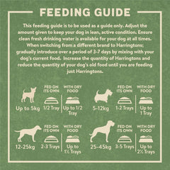 Suitable for all dogs aged 8 weeks and older. This feeding recommendation is to be used as a guide only for a healthy adult dog with normal levels of activity. Adjust the amount given to keep your dog in lean, active condition. If feeding a puppy, adjust according to their appetite to support early development and growth. Ensure clean fresh drinking water is available for your dog at all times. When switching from a different brand to Harringtons; gradually introduce over a period of 3 to 7 days by mixing with your dog’s current food. Increase the quantity of Harringtons and reduce the quantity of your dog’s old food until you are feeding just Harringtons. Store in a cool dry place. After opening keep unused contents in a sealed container. Keep refrigerated & use within 72 hours.