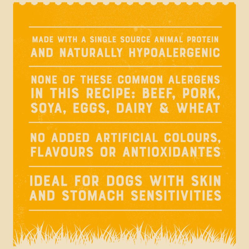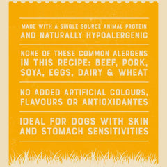Designed with a grain-free recipe, this dog food uses alternative carbohydrate sources, making it ideal for even the most sensitive dogs. The carefully selected ingredients, including nutritious vegetables, provide a complete and balanced diet. It's free from artificial colors, flavors, and preservatives, making it a natural and hypoallergenic choice that minimizes unwanted reactions.