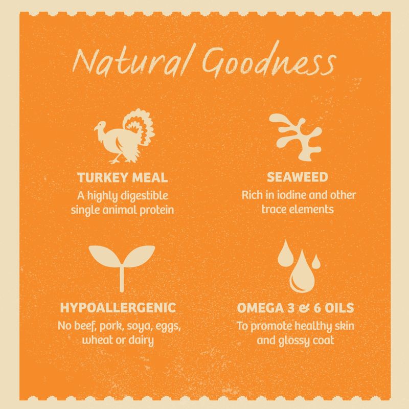 Ingredients: Turkey (29.8%), pea starch, dried carrots (1%, equivalent to 8.1% carrots), dried potato (1%, equivalent to 4.3% potato), dried peas (1%, equivalent to 3.4% peas), dried sugar beet pulp, glucose, sunflower oil (0.46%), pea protein, linseed oil (0.27%), mono-potassium phosphate, sodium chloride, alfalfa, seaweed (0.13%), fish oil (0.11%), calcium carbonate, tomato powder, magnesium oxide. Additives per kg: Nutritional additives: Vitamin D3 (147 IU), iron (2.1mg), iodine (0.08mg), copper (6.8mg), manganese (1.2mg), zinc (46mg).