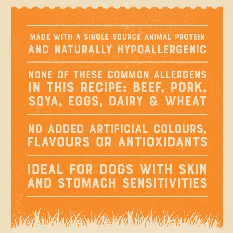 This complete wet food, designed for dogs aged 12 months to 7 years, can be fed on its own or as a delicious topper for dry food. The pouches exclude ingredients known to cause intolerances, such as beef, pork, wheat, wheat gluten, dairy, eggs, or soya.