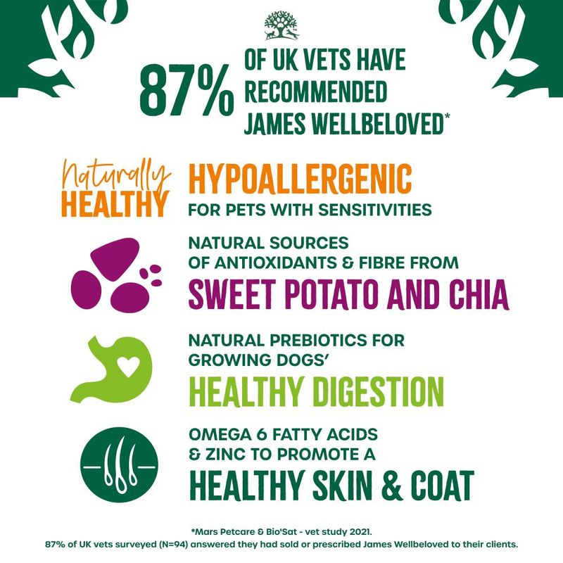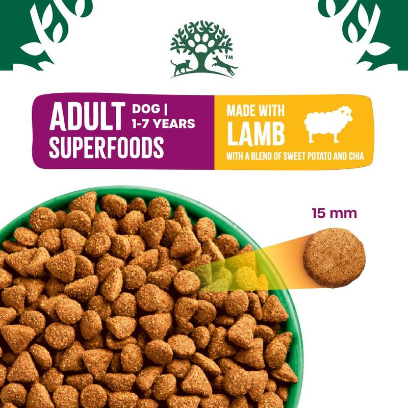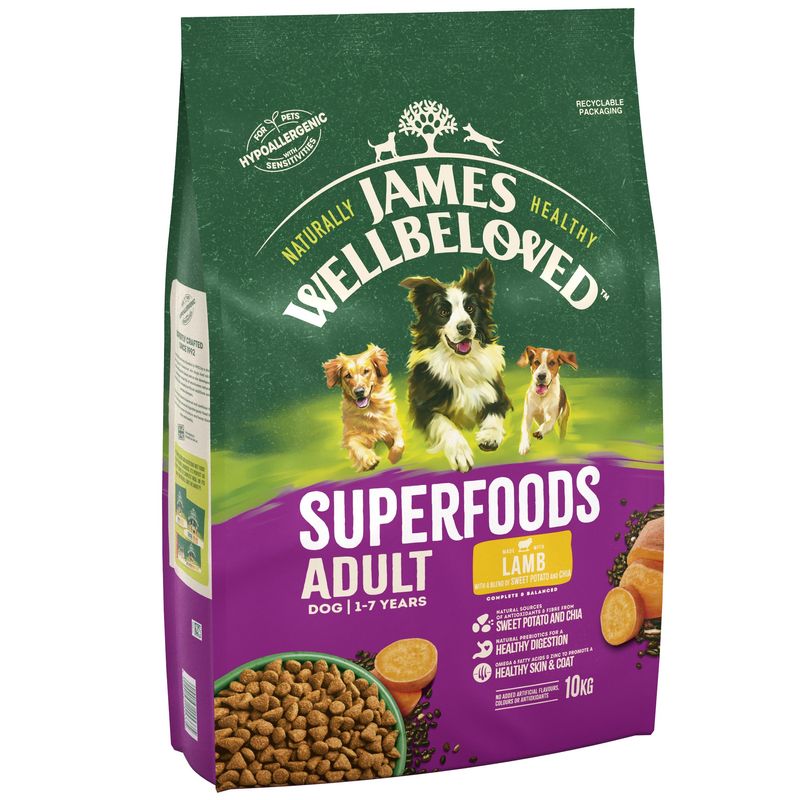 James Wellbeloved Adult Superfoods - Lamb with Potato & Chia is a complete dry food for adult dogs, naturally hypoallergenic and made with 100% natural lamb as a selected source of protein, combined with health-promoting superfoods. It contains sweet potato for beneficial fibre, while chia provides essential omega-3 for skin and coat health. This James Wellbeloved Adult Superfoods - Lamb with Potato & Chia dry dog food also uses selected sources of carbohydrate, such as rice and barley, which are beneficial in reducing unwanted dietary reactions. The irresistible recipe of this kibble is naturally full of flavour and provides fibre, vitamins, minerals, and antioxidants to support your dog's overall health, digestion, and immune system. James Wellbeloved Adult Superfoods - Lamb with Potato & Chia at a glance: