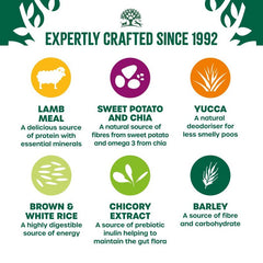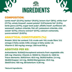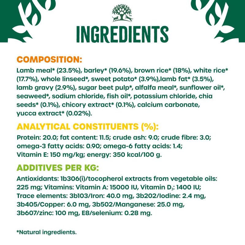 Ingredients: Lamb meal* (23.5%), barley*, brown rice*, white rice*, whole linseed*, sweet potato* (3.9%), lamb fat* (3.5%), lamb gravy (2.9%), sugar beet pulp*, alfalfa meal*, sunflower oil*, seaweed*, sodium chloride, fish oil*, potassium chloride, chia seeds* (0.1%), chicory extract* (0.1%), calcium carbonate, yucca extract*, green tea extract* (0.003%), pomegranate extract* (0.001%), rosemary extract* (0.001%). *Natural ingredients. Additives per kg: Antioxidants: 1b306(i)/tocopherol extracts from vegetable oils (225mg). Vitamins: Vitamin A (15,000 IU), vitamin D3 (1400 IU). Trace elements: 3b103/iron (40mg), 3b202/iodine (2.4mg), 3b405/copper (6mg), 3b502/manganese (25mg), 3b607/zinc (100mg), E8/selenium (0.3mg).