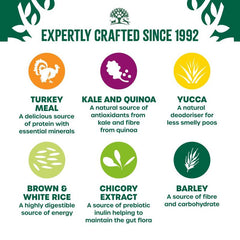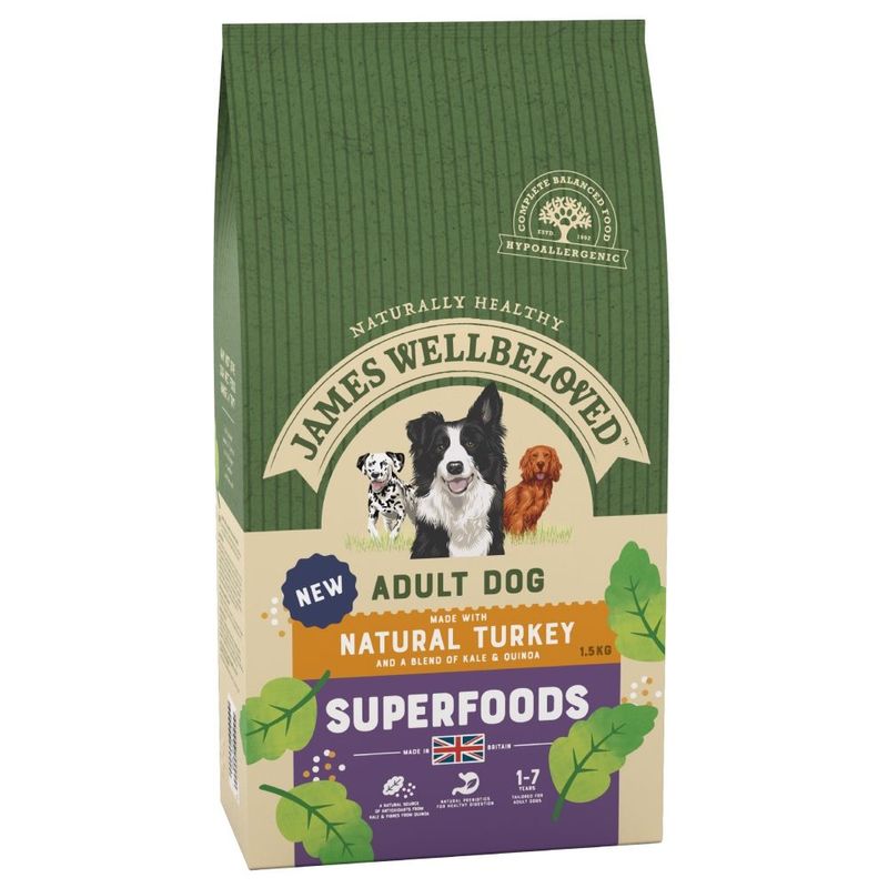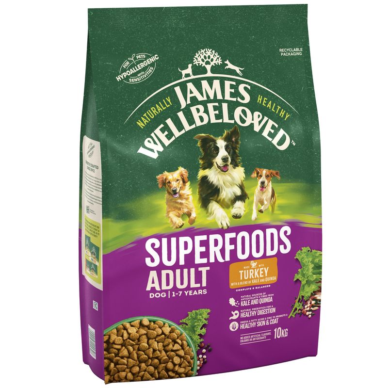 Indulge your furry friend with James Wellbeloved Adult Superfoods - Turkey with Kale & Quinoa. For an initial 3-8 weeks, observe the disappearance of intolerance symptoms. If so, continue feeding indefinitely for lifelong well-being.