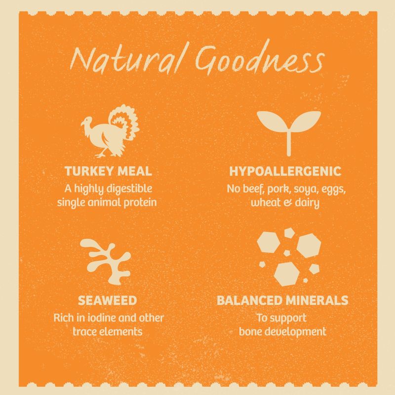 What sets James Wellbeloved apart is its commitment to avoiding common allergens. This Turkey with Rice & Vegetable formula contains no artificial colors, flavors, or preservatives. It's free from beef, pork, wheat, wheat gluten, dairy, eggs, and soya.
