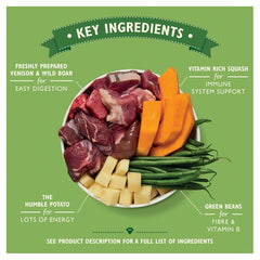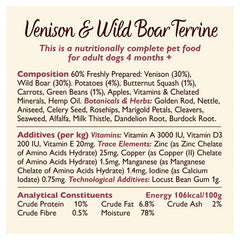 Ingredients: 60% freshly prepared: venison (30%); wild boar (30%), potatoes (4%), butternut squash (1%), carrots, green beans, apples, vitamins & minerals, hemp oil [source of omega-3 and -6], herbs & botanicals [golden rod, nettle, aniseed, celery seed, rosehips, marigold petals, cleavers, seaweed, alfalfa, milk thistle, dandelion, burdock root].