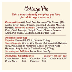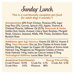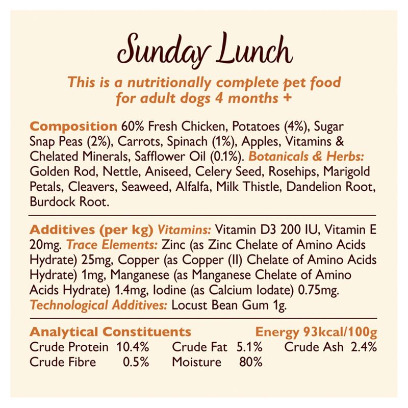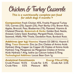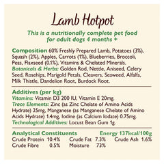 Ingredients: Chicken & Turkey Casserole: Fresh chicken (45%), freshly prepared turkey (15%), carrots (2%), squash (2%), pearl barley (1%), brown rice, apples, broccoli, peas, blueberries (1%), vitamins & minerals, flaxseed [source of omega-3 & -6], herbs & botanicals [golden rod, nettle, aniseed, celery seed, rosehips, marigold petals, cleavers, seaweed, alfalfa, milk thistle, dandelion root, burdock root. Cottage Pie: Fresh beef (60%), potatoes (3%), carrots (3%), apples, broccoli, green beans, vitamins & chelated minerals, flaxseed [source of omega-3 & -6], herbs & botanicals [golden rod, nettle, aniseed, celery seed, rosehips, marigold petals, cleavers, seaweed, alfalfa, milk thistle, dandelion root, burdock root]. Lamb Hotpot: Fresh lamb (60%), potatoes (3%), squash (2%), apples, carrots (1%), blueberries, broccoli, peas, flaxseed (0.1%), herbs & botanicals [golden rod, nettle, aniseed, celery seed, rosehips, marigold petals, cleavers, seaweed, alfalfa, milk thistle, dandelion root, burdock root]. Sunday Lunch: Fresh chicken (60%), potatoes (4%), sugar snap peas (2%), carrots, spinach, apples, vitamins and chelated minerals, herbs, safflower oil, herbs & botanicals [golden rod, nettle, aniseed, celery seed, rosehips, marigold petals, cleavers, seaweed, alfalfa, milk thistle, dandelion root, burdock root]. Additives per kg: Cottage Pie: Nutritional additives: Vitamin D3 (200 IU), vitamin E (30mg), zinc [as zinc chelate of amino acids hydrate] (15mg), manganese [as manganous chelate of amino acids hydrate] (3mg), iodine [as calcium iodate] (0.75mg). Technological additives: Locust bean gum (1g). Chicken & Turkey Casserole: Nutritional additives: Vitamin D3 (200 IU), vitamin E (30mg),zinc [as zinc chelate of amino acids hydrate] (15mg), copper [as copper-(II)-chelate of amino acids hydrate] (1g), manganese [as manganous chelate of amino acids hydrate] (3mg), iodine [as calcium iodate] (0.75mg). Technological additives: Locust bean gum (1g). Sunday Lunch: Nutritional additives: Vitamin D3 (200 IU), vitamin E (30mg), zinc [as zinc chelate of amino acids hydrate] (15mg), copper [as copper-(II)-chelate of amino acids hydrate] (1mg), manganese [as manganous chelate of amino acids hydrate] (3mg), iodine [as calcium iodate] (0.75mg). Technological additives: Locust bean gum (1g). Lamb Hotpot: Nutritional additives: Vitamin D3 (200 IU), vitamin E (30mg), zinc [as zinc chelate of amino acids hydrate] (15mg), manganese [as manganous chelate of amino acids hydrate] (3mg), iodine [as calcium iodate] (0.75mg), selenium [as organic selenium S.cerevisiae CNCM 1-3060] (0.03mg). Technological additives: Natural cassia gum (2900mg).