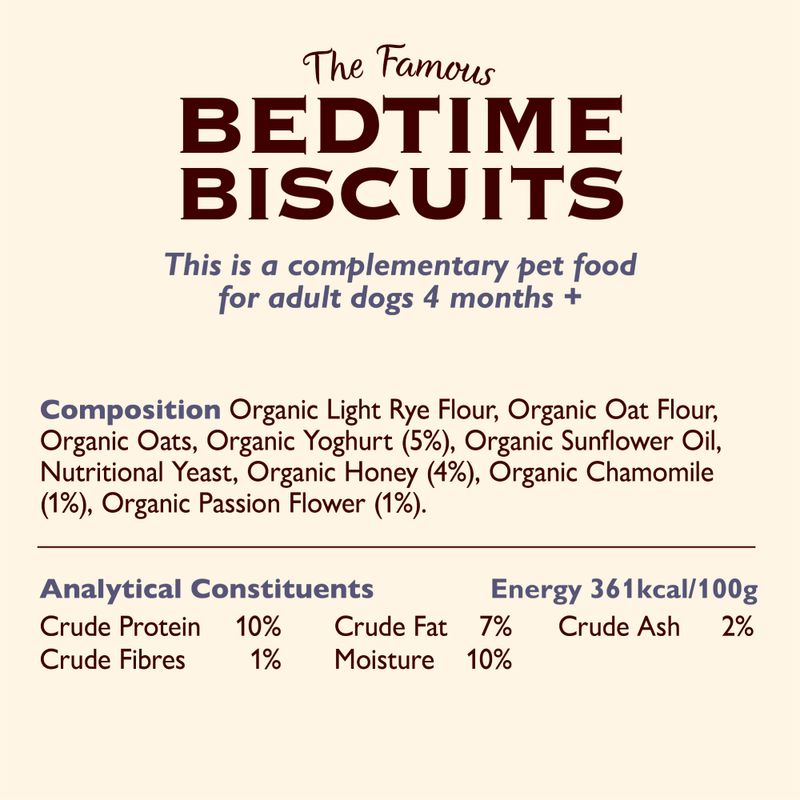 Lily's Kitchen Organic Bedtime Biscuits for Dogs are hypoallergenic, hand-baked dog biscuits made with organic products. Treat your dog at bedtime with these delicious, holistic snacks featuring chamomile and honey for a calming effect, promoting restful sleep and immune support.