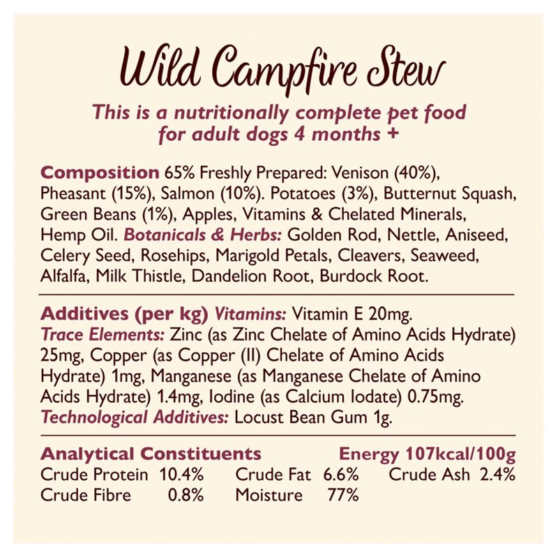 Ingredients: 65% freshly prepared: venison (40%); pheasant (15%); salmon (10%), potatoes (3%), butternut squash, green beans (1%), apples, vitamins & minerals, hemp oil [source of omega-3 & -6], herbs & botanicals [golden rod, nettle, aniseed, celery seed, rosehips, marigold petals, cleavers, seaweed, alfalfa, milk thistle, dandelion root, burdock root]. Additives per kg: Nutritional additives: Vitamins: Vitamin D3 (200 IU), vitamin E (30mg). Trace elements: Zinc [as zinc chelate of amino acids hydrate] (15mg), copper [as copper-(II)-chelate of amino acids hydrate] (1mg), manganese [as manganous chelate of amino acids hydrate] (3mg), iodine [as calcium iodate] (0.75mg). Technological additives: Locust bean gum (1g).
