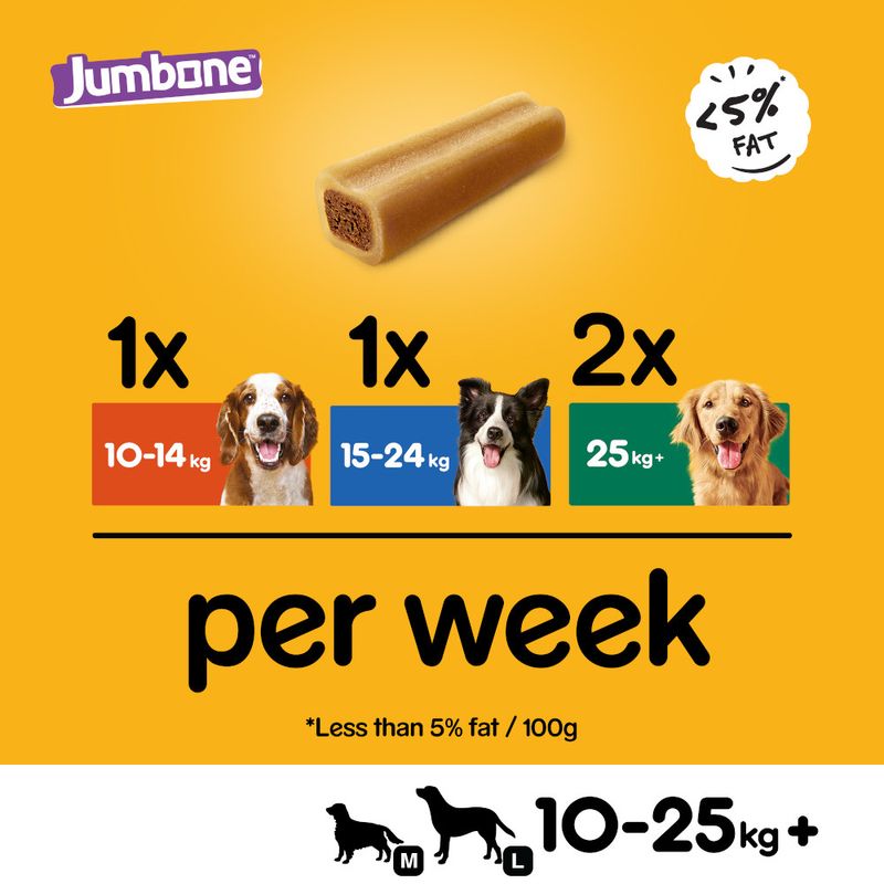 Each Jumbone® provides 7% of the daily energy requirements of a 10 kg dog. Reduce your dog's main meal accordingly. Not suitable for dogs under 10 kg or puppies under the age of 9 months. Use within 14 days of opening and store in a cool and dry place. Fresh drinking water should always be available.