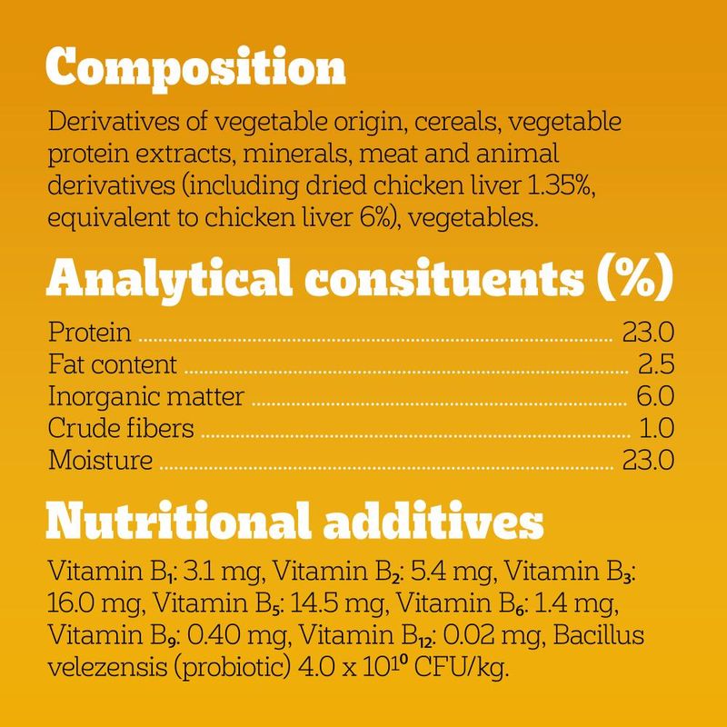 Ingredients: Vegetable by-products, grains, vegetable protein extracts, minerals, meat and animal by-products (including dried chicken liver 1.35%; equivalent to chicken liver 6%), vegetables. Additives per kg: Antioxidants, vitamin B1 (3.1mg), vitamin B2 (5.4mg), vitamin B3 (16.0mg), vitamin B5 (14.5mg), vitamin B6 (1.4mg), vitamin B9 (0.40mg), vitamin B12 (0.02mg), bacillus velezensis (probiotic) (4.0 x 10¹⁰ CFU/kg).