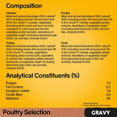 The mixed selection in gravy includes Beef & Vegetable, Chicken & Vegetable, Beef & Lamb, and Turkey & Carrots. The Beef, Liver, and Vegetables pack feature Beef & Lamb Mix, Beef & Liver Mix, Lamb & Liver Mix, and Duck recipes. Meanwhile, the Poultry Selection offers Chicken, Turkey, Poultry, and Duck varieties.