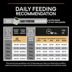 Weaning and growth: during weaning, between the ages of 3 - 6 weeks, offer your dog moistened PURINA PRO PLAN Puppy 3 - 4 times per day. After weaning, feed according to the table. Gradually reduce the added water from 3 months. Ensure clean, fresh drinking water is always available.