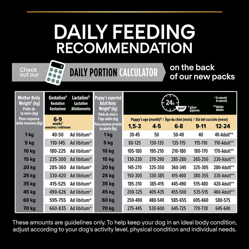 Weaning and Growth: During the weaning period (between 3 and 6 weeks) offer the puppy PRO PLAN Puppy mixed with water 3 to 4 times a day. After weaning, feed according to the guidelines in the chart. From 3 months, gradually reduce the amount of water added. A slim body shape is important for healthy development. Adjust daily feeding amount based on activity level, physical condition and individual needs. Fresh, clean water should always be available. To monitor your dog's health, consult a vet regularly. Store cool and dry.