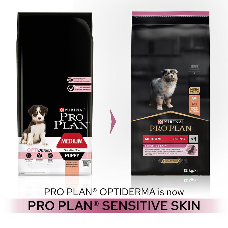 Are you seeking specialized nutrition for your medium-breed puppy with sensitive skin? Introducing PURINA PRO PLAN Medium Puppy Sensitive Skin, previously known as OPTIDERMA. Crafted with a nutrient-rich recipe, this dry food boasts a delicious blend of salmon and added fish oil, promoting a healthy skin and coat.