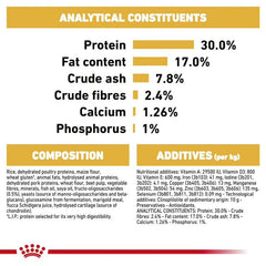 Ingredients: Rice, dehydrated poultry protein, maize flour, wheat gluten*, animal fat, hydrolysed animal protein, dehydrated pork protein, wheat flour, beet pulp, vegetable fibre, minerals, fish oil, soyba oil, fructo-oligo-saccharides (0.5%), yeast (source of mannan-oligo-saccharides and betaglucans), glucosamine from fermentation, marigold meal, yucca Schidigera juice, hydrolyzed cartilage (source of chondroitin). *L.I.P.: Protein selected for its very high digestibility. Additives per kg: Nutritional additives: Vitamin A (29,500 IU), vitamin D3 (800 IU), vitamin E (600mg), E1 [iron] (41mg), E2 [iodine] (4.1mg) , E4 [copper] (13mg), E5 [manganese] (54mg), E6 [zinc] (135mg), E8 [selenium] (0.09mg). Technological additives: Clinoptilolite of sedimentary origin (10g). Contains preservatives and antioxidants.