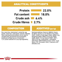 Ingredients: Rice, maize flour, wheat gluten*, animal fat, egg powder, wheat flour, maize gluten, minerals, vegetable fibres, hydrolysed animal proteins, fish oil, soya oil, marigold meal, glucosamine from fermentation, hydrolysed cartilage (source of chondroitin). *L.I.P.: Protein selected for its very high digestibility. Additives per kg: Nutritional additives: Vitamin A (28,000 IU), vitamin D3 (800 IU), taurine (2g), E1 [iron] (79mg), E2 [iodine] (4.9mg), E4 [copper] (6mg) , E5 [manganese] (54mg), E6 [zinc] (151mg), E8 [selenium] (0.24mg). Sensory additives: Contains preservatives and antioxidants.