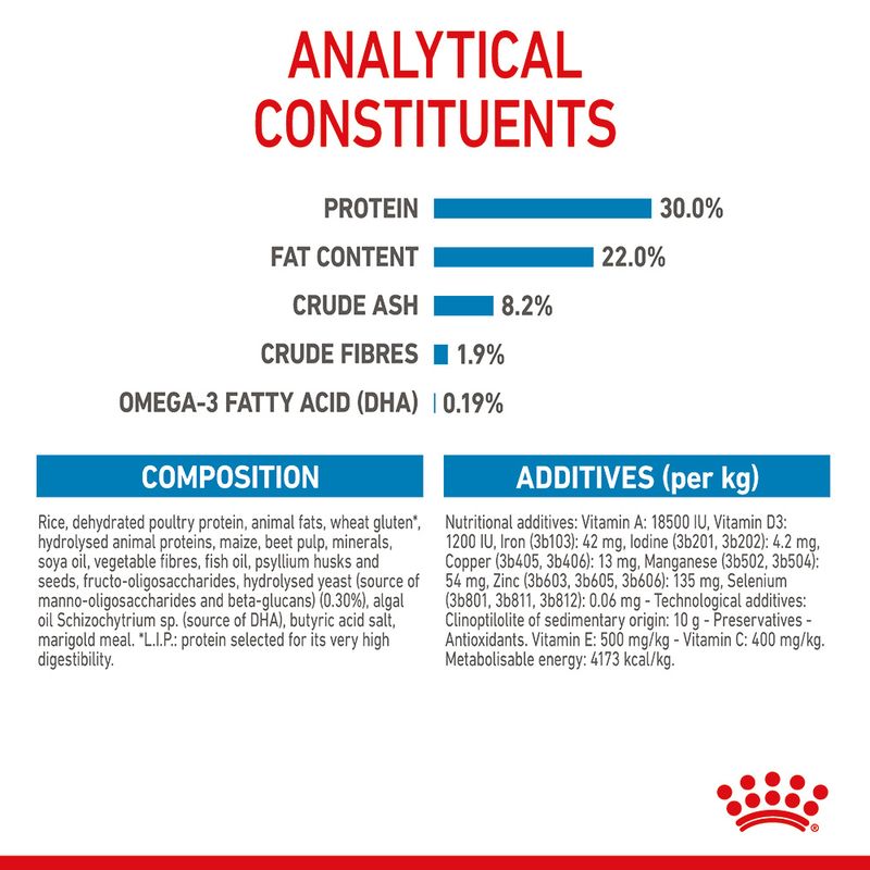 Additives per kg: Nutritional additives: Vitamin A (18,500 IU), vitamin D3 (1200 IU), vitamin E (500mg), vitamin C (400mg), iron (42mg), iodine (4.2mg), copper (13mg), manganese (54mg), zinc (135mg), selenium (0.06mg). Technological additives: Clinoptilolite from sedimentary sources (10g), preservatives, antioxidants.