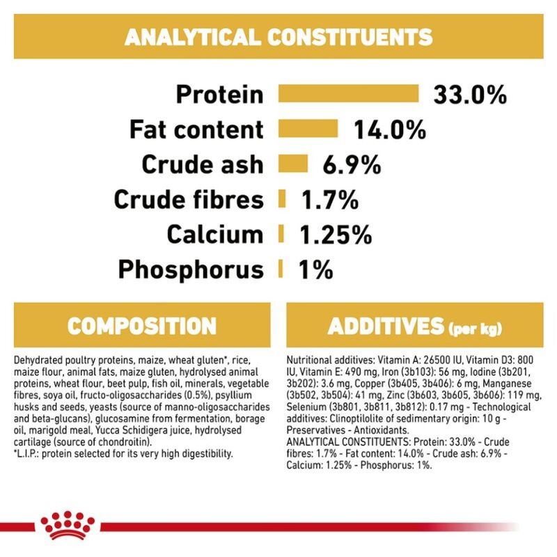 *L.I.P.: Selected, digestible proteins with high biological value. Additives per kg: Nutritional additives: Vitamin A (26,500 IU), Vitamin D3 (800 IU), Vitamin E (490mg) - E1 [iron] (56mg), E2 [iodine] (3.6mg) , E4 [copper] (6mg), E5 [manganese] (41mg), E6 [zinc] (119mg), E8 [selenium] (0.17mg). Technological additives: Clinoptilolite from sedimentary sources (10g). Contains preservatives and antioxidants.