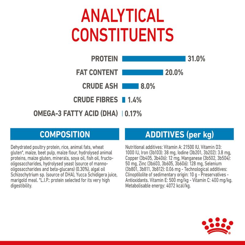 Designed specifically for the rapid growth of small breed puppies, Royal Canin Mini Puppy boasts a high energy content tailored to meet their increased needs during this intense growth phase. This precise calorie balance also helps manage weight gain, ensuring healthy development.