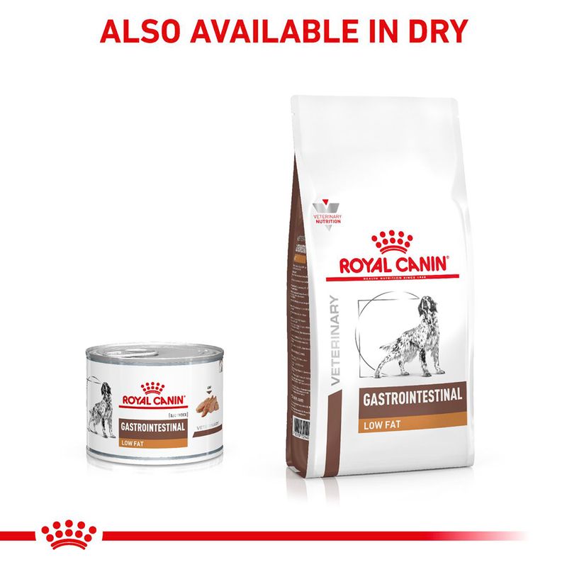 Choosing a specialized diet is crucial for managing your dog's digestive health. Introducing Royal Canin Veterinary Canine Gastrointestinal Low Fat Loaf, a wet food crafted for dogs with hyperlipidemia. Tailored with a reduced fat content, this diet supports digestion and regulates fat metabolism.