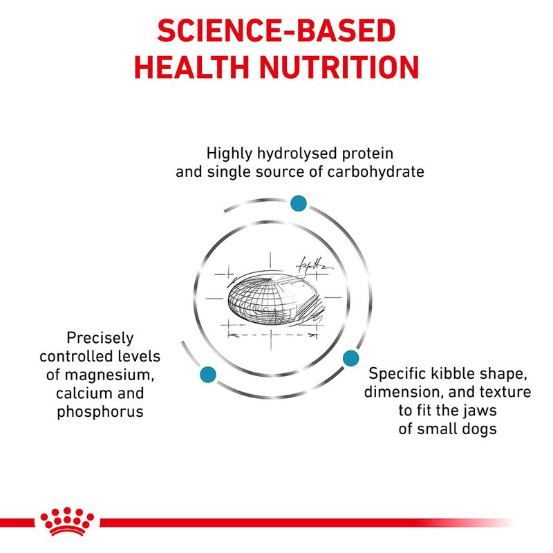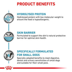Royal Canin Veterinary Dog - Hypoallergenic Small Dog provides your small dog with hydrolysed proteins, which can help to reduce instances of intolerance. It also contains omega-3 fatty acids DHA and EPA. This dietetic dog food has a special recipe that can contribute to dental- and oral hygiene.