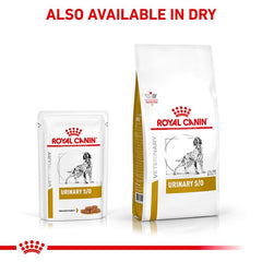This Royal Canin Veterinary Dog - Urinary S/O in Gravy dietetic wet dog food is specially designed for adult dogs with urinary stones. The pouches contain tender meat chunks in gravy, making it easy to portion your dog’s meals. This urinary diet helps combat stone build-up, supports urine dilution, and reduces the risk of new stones forming.