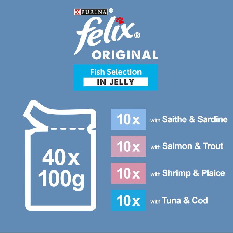 Indulge your cat with our Fish Selection, featuring Saithe & Sardine, Salmon & Trout, Shrimp & Plaice, and Tuna & Cod. Or opt for the Mixed Selection with Beef, Chicken, Tuna, and Salmon. Whichever you choose, Felix Original Pouches guarantee an irresistibly delicious experience.