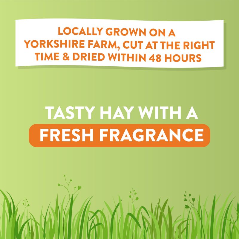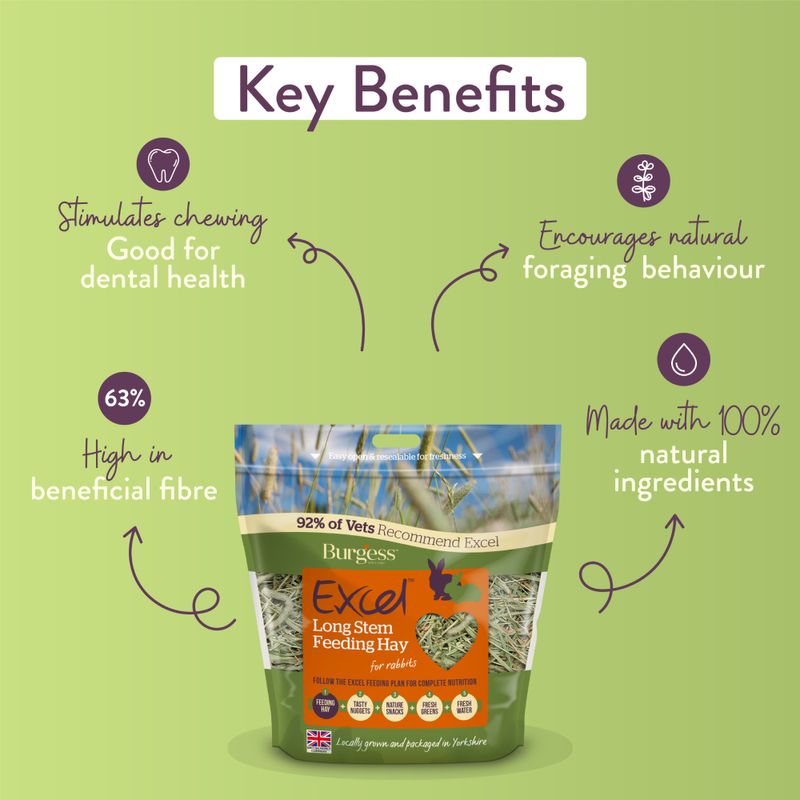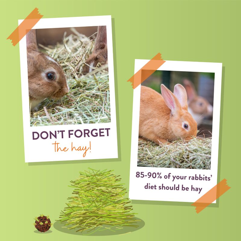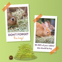 Did you know? Your rabbit's diet should consist of 85-90% hay. Enhance their diet with our Feeding Hay with Dandelion & Marigold for dental and digestive health. Add Burgess Nuggets for key vitamins and minerals, and don't forget fresh greens for mental well-being. Always provide fresh drinking water. Check our website for vegetable advice!
