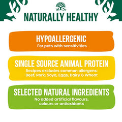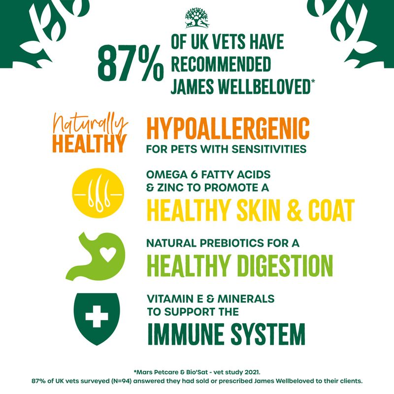James Wellbeloved cat and dog food and treats exclude beef, pork, wheat, wheat gluten, dairy products, eggs, or soya, reducing the risk of food intolerances.