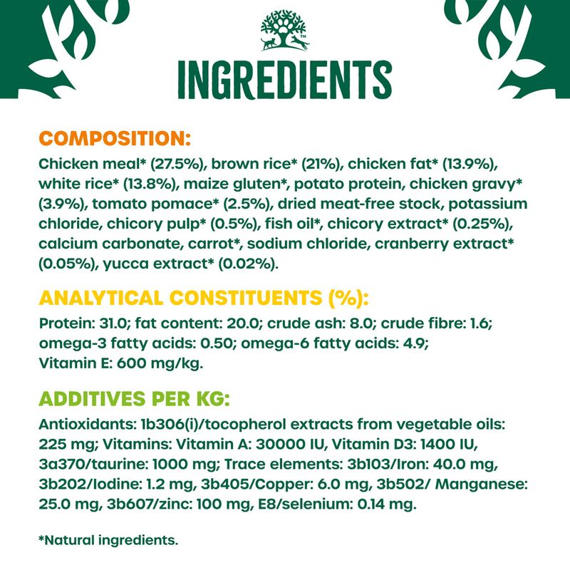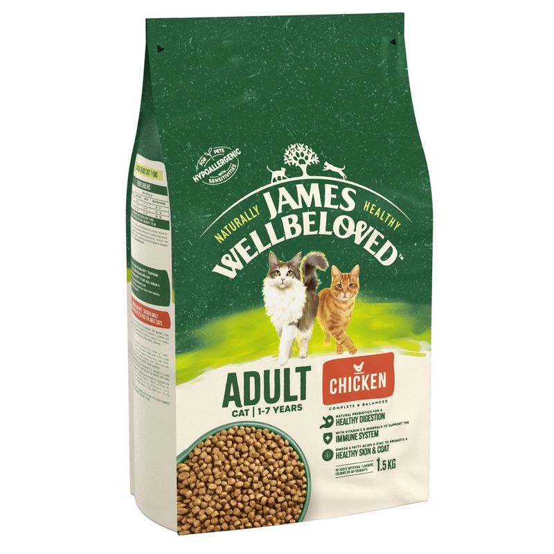 Taking into account the specific needs of your cat, James Wellbeloved Adult Chicken & Rice complete cat food includes added omega-3 oils to promote a soft and silky coat. Natural supplements like chicory and cranberry are incorporated to support your cat's immune system and maintain urinary tract health. The crunchy nuggets are baked, smothered in delectable gravy, and then dried for convenient use.