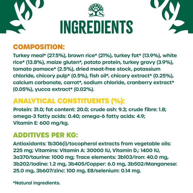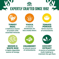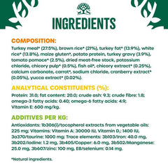 James Wellbeloved Adult Turkey & Rice cat food combines wholesome elements like brown and pearl rice, potato, cranberries, tomato, carrots, chicory, and yucca extract. This balanced mix supports urinary tract health, maintains a healthy gut flora, and acts as a natural deodorizer.