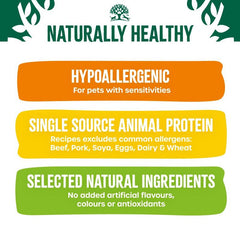 Free from beef, pork, wheat, wheat gluten, dairy, eggs, and soya, it's a wholesome choice. Try our grain-free, hypoallergenic wet food for variety.