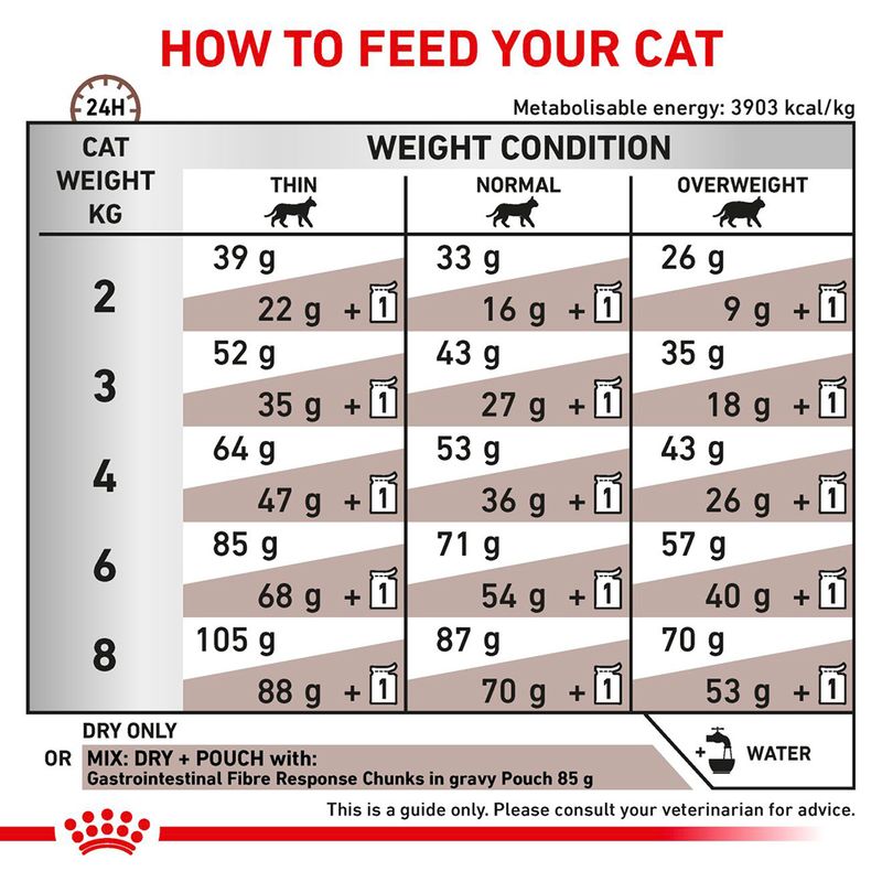 Feeding recommendation: Royal Canin Expert Feline Gastrointestinal Fibre Response is a complete food for cats. Only dry food: