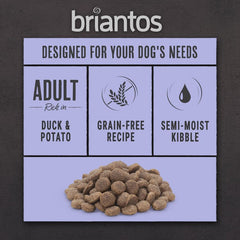 Briantos Adult Grain Free Duck & Potato is a complete dry food for adult dogs. These feeding amounts are only guidelines. All dogs are different and actual feeding amounts will depend on your pet’s age, activity levels and other, individual circumstances. Monitor your pet's weight and adjust feeding amounts as required. Introduce new food slowly over a period of 5-8 days. Fresh water should be provided at all times. Store in a cool and dry place.