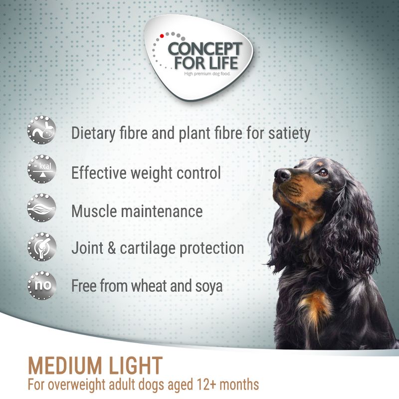 Concept for Life Medium Light is tailored, premium nutrition based on the individual dietary requirements of overweight, adult medium breeds of dogs, aged 12 months and over. This complete dry dog food has the following benefits: