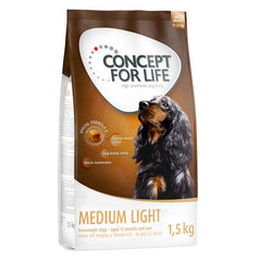 Concept for Life Medium Light is a premium, complete dry food for overweight, medium breed adult dogs (aged 12 months and over, weighing between 11-25kg) and is available in the following sizes: 1.5kg, 6kg (4 x 1.5kg), and 12kg.