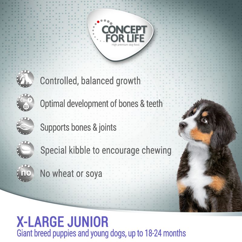 Concept for Life X-Large Junior is available in sizes: 1.5kg, 6kg (4 x 1.5kg), and 12kg, catering to giant breed junior dogs weighing between 45 - 100kg.